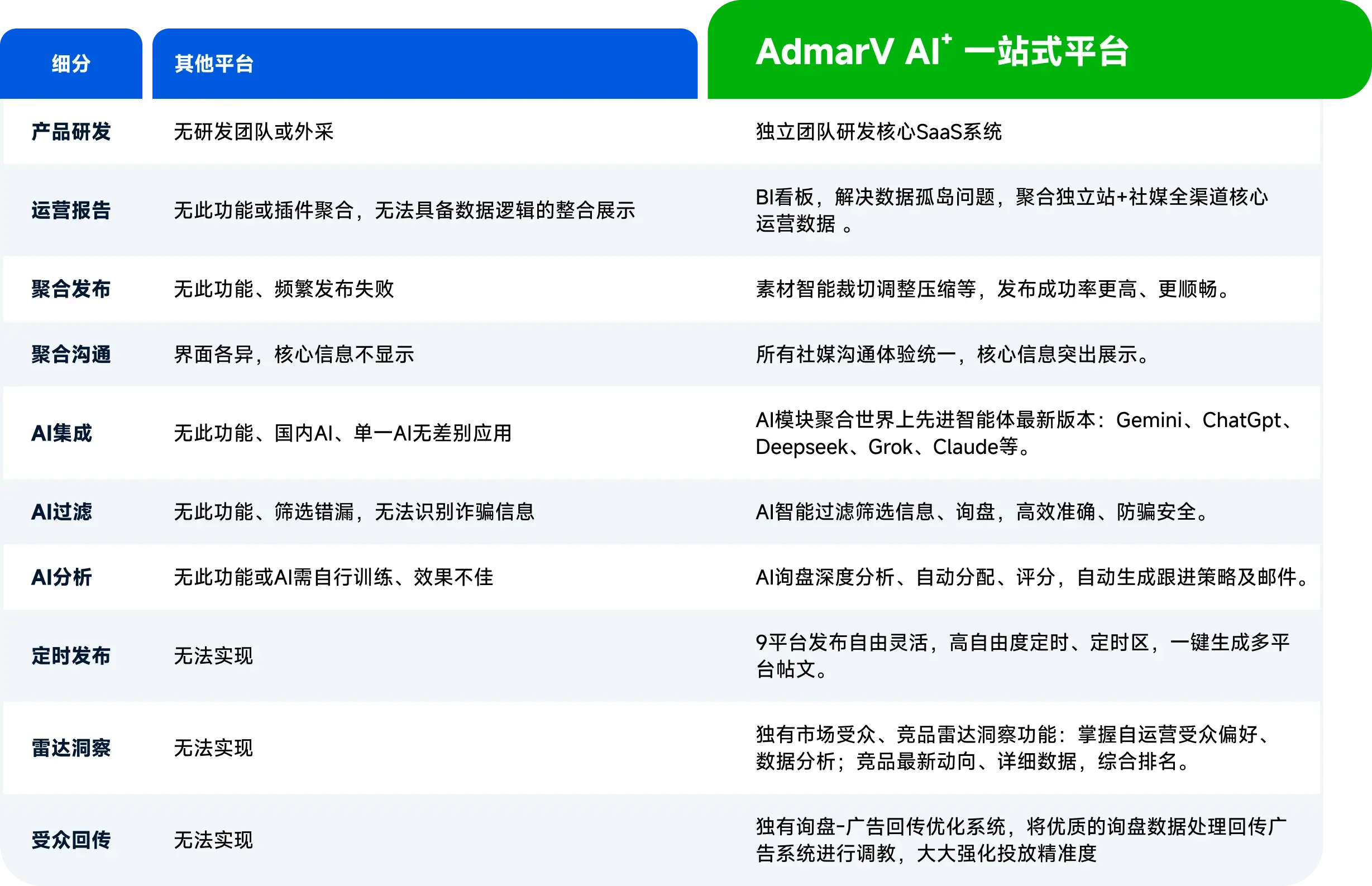 告别数据孤岛。AdmarV AI⁺数字平台将独立站、社媒、CRM 与询盘数据无缝熔炼。 独家研发模型实时反哺业务,让广告投放更精准,运营策略更聪明。 数据越沉淀,模型越强大,获客越轻松。